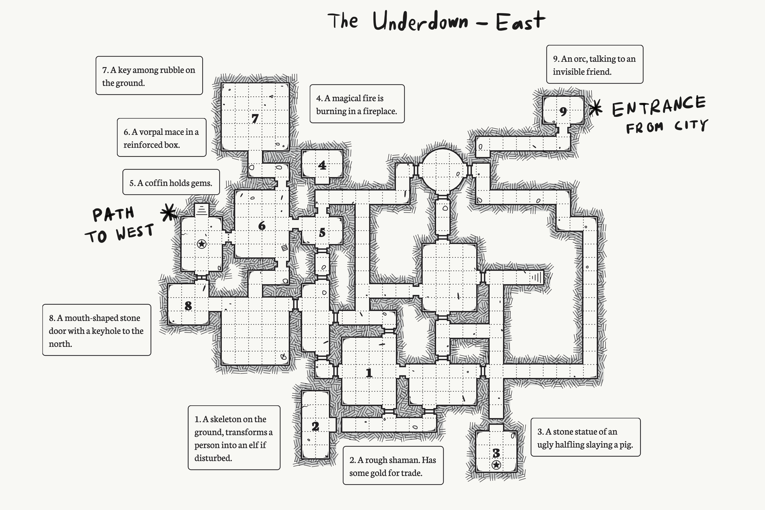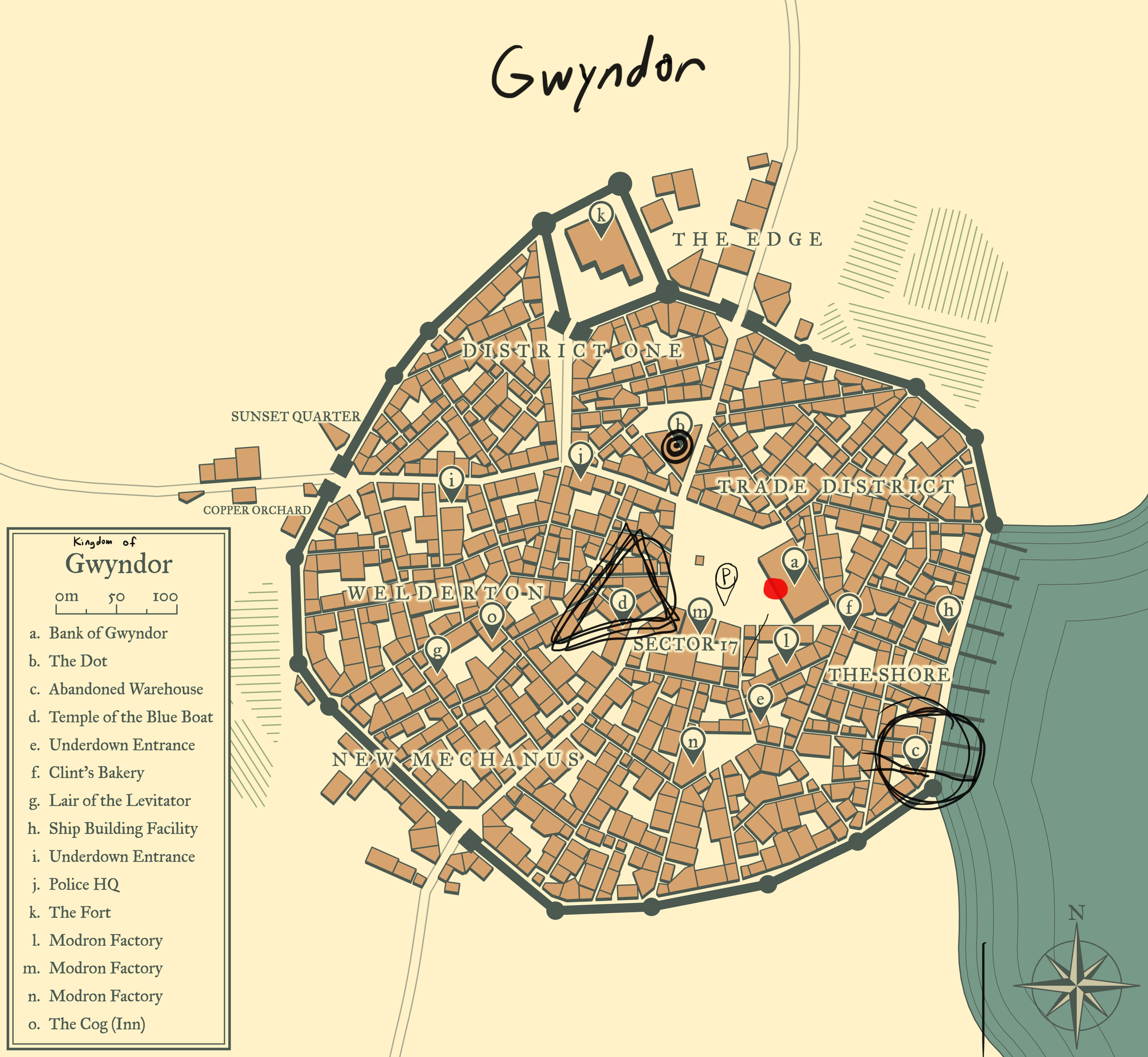 Maps were illustrated with Photoshop and annotated with an iPad during campaign sessions.