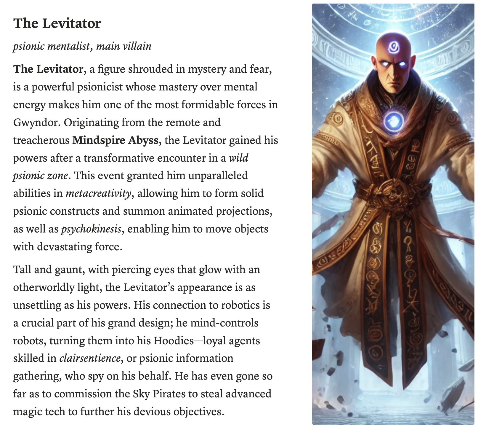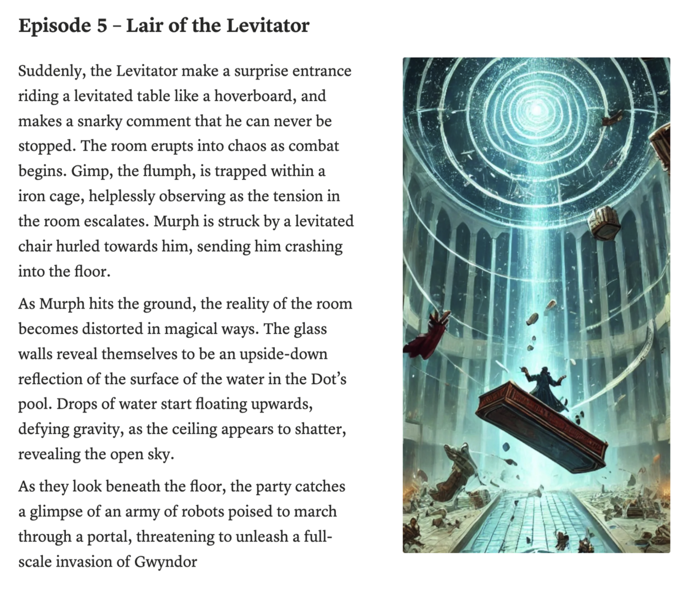 After an outlaw group of mechanical humanoids settle in the City of Gwyndor, a greedy telekinetic mentalist known as "The Levitator" seeks to take advantage of the chaos by hacking into the minds of the robots and taking control over Gwyndor for himself. The only thing standing in the way of robot domination is a ragtag group of unlikely freedom-fighters...