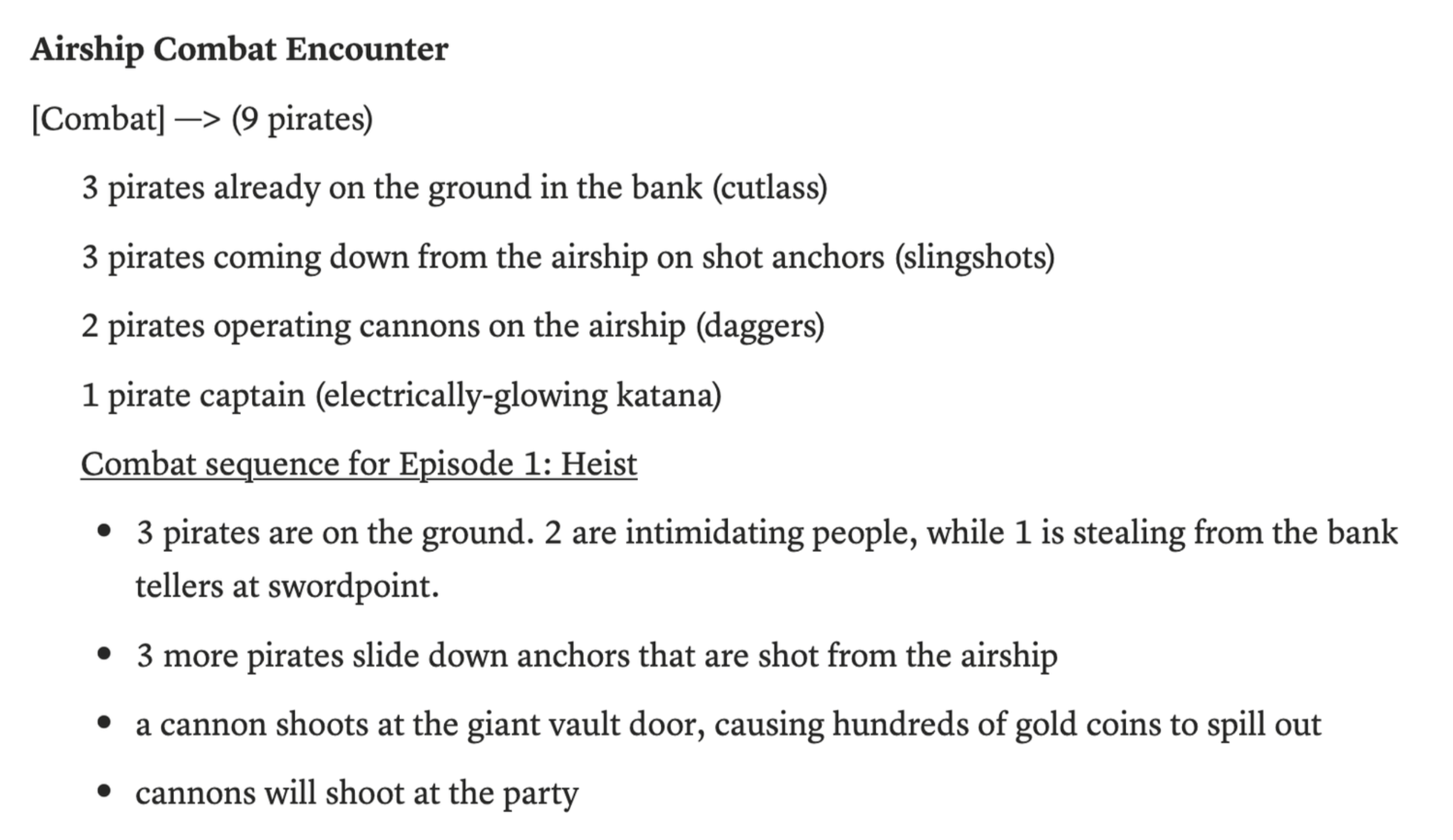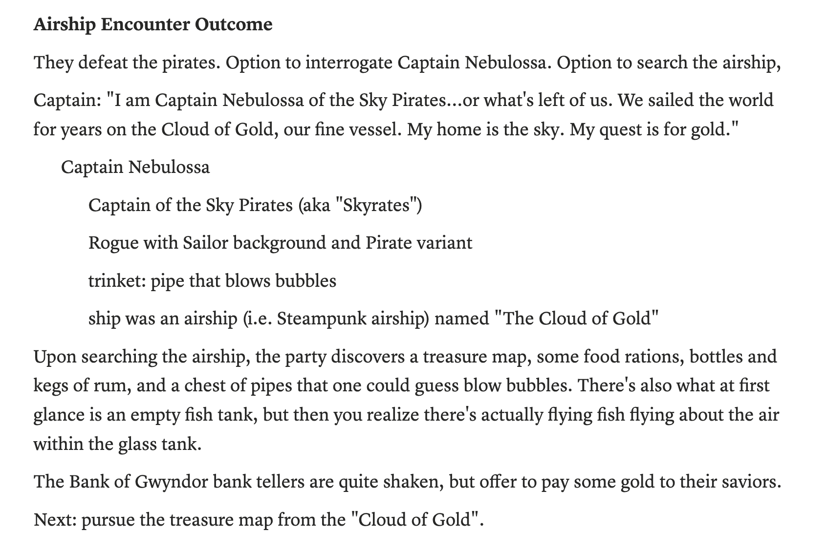 Plot Hook: The bank the players initially find themselves in is immediately robbed by pirates on a flying airship called “The Cloud of Gold.”