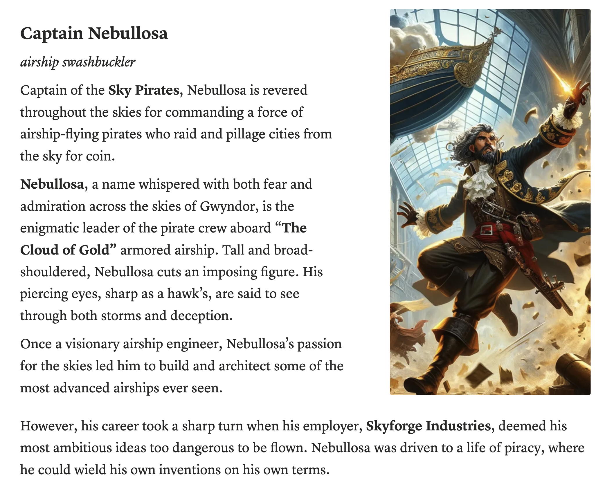 Narrative Themes: Swashbuckling adventure, deception, mystery, "mechanology" - artifacts imbued with magic